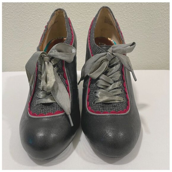 * Oxford-style lacing, stacked cone heels, mixed materials (leather, fabric, synthetic)