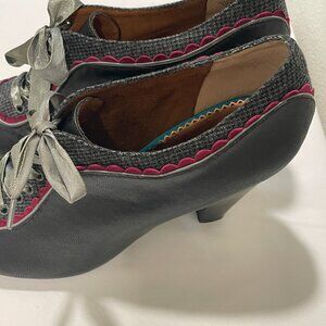 * Black upper with burgundy scallop trim, gray plaid fabric, gray satin ribbon laces