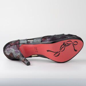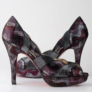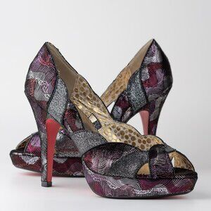 The Poetic License Vintage Revival is a knockout women's pump set in a suede, leather and man-made upper. Black base with a funky, swirl metallic print pattern in bright purple, shiny silver, and candy apple / cherry red. Scalloped edge soft of design with a little twist in the front.