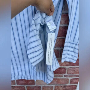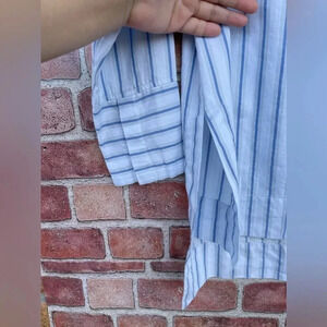 High low open sides hidden buttons strip shirt boxy fit ,shades of blue gray and white.