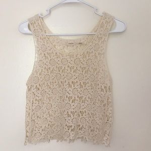 Sheer crochet crop top. Adorable floral pattern. Looks great with cutoff shorts and a bandeau!