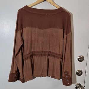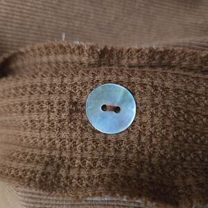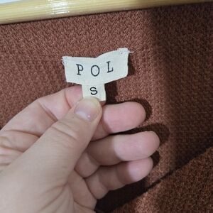 Stylish rust button-up cardigan with front pockets and tie detail. Perfect for layering. Raw hem and stretchy material. Light weight. ptp: 23.5" length: 24.5" waist: 23"