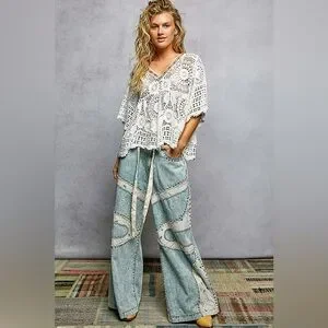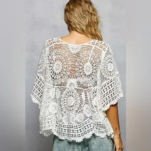 This short-sleeve crochet top combines a V-neck with a roomy, flared silhouette for a comfortable and airy feel. The varied crochet pattern detailing and border accents add a touch of elegance to the design. The trimmed neckline band and scalloped sleeve and hem openings offer a soft and decorative finish. The solid color base and normal washing ensure a clean and refined look. Elevate your style with this chic crochet top that blends intricate details with a sophisticated design in a versatile solid color.