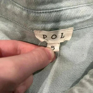 POL At Twilight Full Size Plaid Contrast Shacket in size small. This is a light blue jacket with pink plaid details. Has raw hems. In good used condition, may have some minor thread wear.