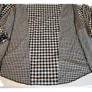Statement gingham dress with three sizes of black and white checks in a patchwork design, frayed hem & collar, and raw edge seams for a laid-back BOHO vibe. Great for school, the office, casual or out to dinner, since this dress is also a button up, it can be used to layer or as a jacket.