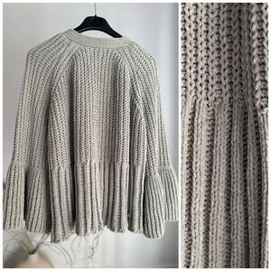 Oversized with big knit bell sleeves and cable-knit lower half. Can tie in the front or leave untied.