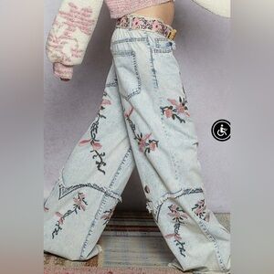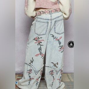 POL Blue Wide Leg Denim Pants Floral Embroidery