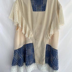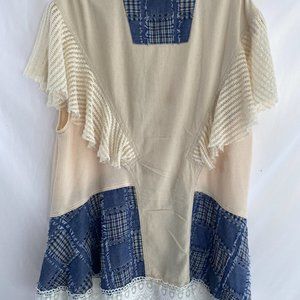 POL Bohemian Lacy White, Cream & Blue Patchwork Mini Dress Tunic Top NWOT Women's Size Large