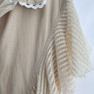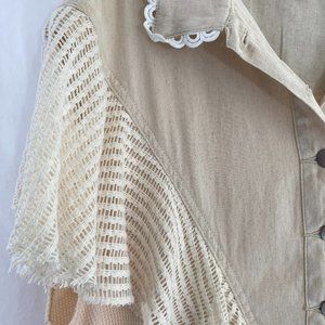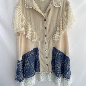 Gorgeous multi-media cream, white & blue patchwork tunic that can be worn as a short, or mini dress. Delicate cream-colored lace overlays the sleeveless arms, white lace alone the bottom hemline and a blue patchwork print on the bottom panels. Silver button closure front. Simply gorgeous whether you wear it as a top or as a dress. This piece would look great with leggings as well. You may want to wear a camisole underneath as the dramatic arm holes are large. Brand new without tags. Never worn, zero flaws. 100% Cotton. Due to the delicate lacy features, manufacturer recommends hand wash cool water and hang or lay flat to dry.