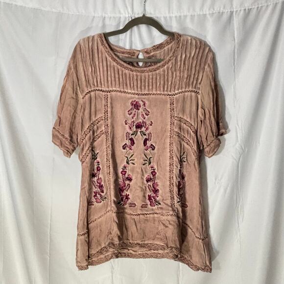 POL Boho Embroidered Floral Blouse Pink Mauve Peasant Top Size Medium