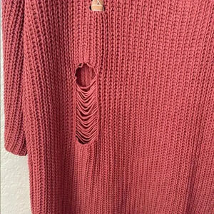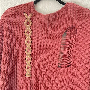 Stay cozy and stylish with this beautiful rusty mauve sweater. Distressed crochet style cardigan/sweater. Is laced with a tan velvet ribbon. Has intentional, distressed holes. Meant to look BoHo. In very good preowned condition.