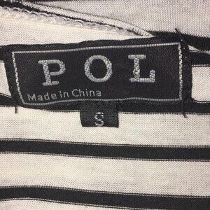 The POL Briana High Low Top with Lace Hem Size Small is a chic blend of comfort and style. This black and white striped print top boasts a scoop neckline, short sleeves, and a lace hem detail.