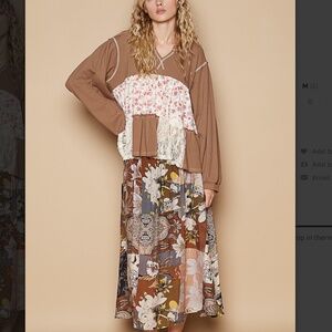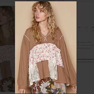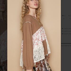 Stylish brown top with floral cream lace detail. Relaxed fit. Perfect for casual wear. Very comfy and cute! Has lace and floral accents.