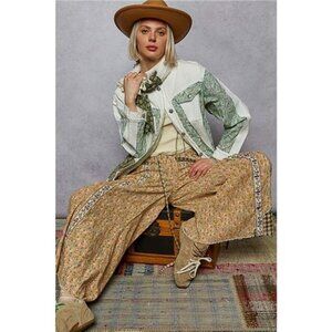 POL Button Down Patchwork Denim Jacket with Floral Print Details