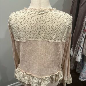 This piece blends a soft, ribbed knit body with charming floral print fabric and delicate lace trim for a unique, bohemian look. It features a ruffled hem, a functional button-front closure, and a cute little floral pocket. It's easy to style and perfect for transitioning between seasons. Pair it with your favorite denim for an effortlessly chic outfit.