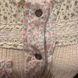 Features: Ribbed knit fabric, floral print accents, lace trim, ruffled hem and cuffs, front pocket, button-front