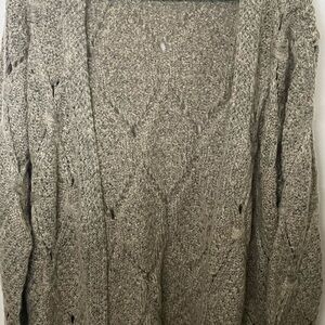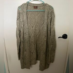Embrace the cozy charm of this never worn oatmeal cardigan from POL, featuring a cable knit pattern that adds texture and warmth. Its open-front design and relaxed fit make it perfect for layering during cooler weather. The longer length offers a versatile style that pairs effortlessly with any outfit. Length is 35”.