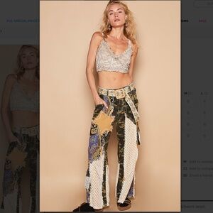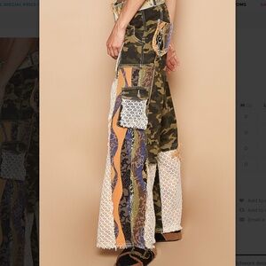 Distinctive camo and lace design. Flare and wide leg cut. Features floral accents. Bold fashion statement. In good preloved condition. Lost some weight and now they do not fit. I loved these pants so much that I ended up getting a pair in a smaller size. Measurements in the photo.