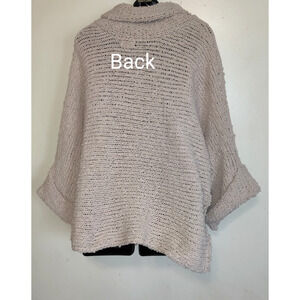 Previously Owned Chunky Chenille type turtleneck sweater. Beige in color. Large slit openings on bottom of each side. 3/4 length sleeves that are cuffed.