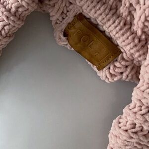This cozy sweater features a soft pink hue and a chunky cowl neck, perfect for adding warmth and style to your wardrobe. There are snags throughout the sweater.