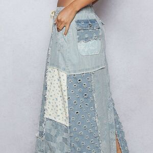 NEW! POL Clothing Floral Pattern Denim Patchwork Maxi Skirt. This charming creation features a patchwork of flowery designs that brings a carefree, boho spirit to your wardrobe. POL does NOT have labeled hang tags - NEW in poly.