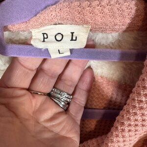 "POL Clothing - Next Level Top - Pink, Cream - L - Soft blush hoodie with cream accents. Features a cozy hood and front pocket. Stylish striped design. -