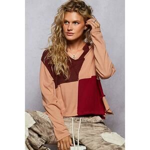 POL Color Block Contrast Notch Neck Long Sleeves Relaxed Fit Top | Burnt Coral