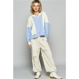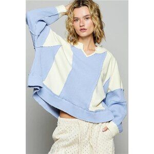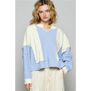 POL Color Block Waffle Knit Raw Hem Sweatshirt
