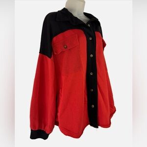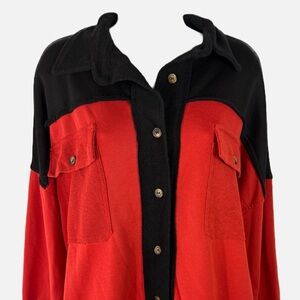 Elevate your casual style with this POL red and black color block button down jacket. Features a cozy yet lightweight fabric, long sleeves, and a relaxed fit – perfect for layering. The bold color block design and button front closure make this jacket an easy statement piece for your wardrobe. Pair with jeans or leggings for an effortlessly chic look.