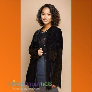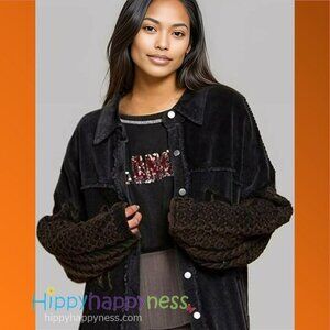 Designed in corduroy jacket with sweater sleeve & front and side pockets (one pocket is somewhat closed at opening and can't be separated, but the other side pocket is open giving 3 full usable pockets (the fourth is usable but requires some maneuvering), midi-length, oversized fit with long sleeve, distressed detail, contrast thermal fabric for added detailing. The sweater material is brown distressed.