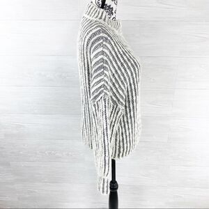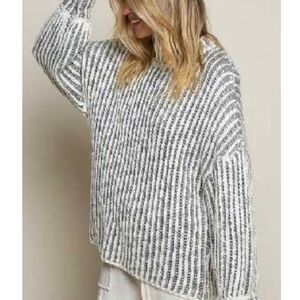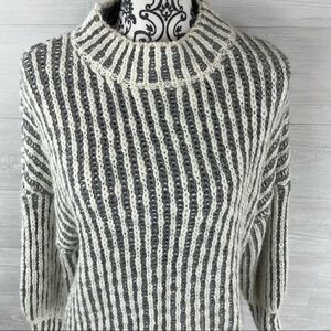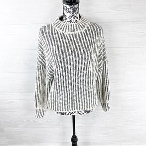 POL Coze Handmade sweater size medium. Grey and white 2 tone weave striped acrylic/wool blend material. Hand it down for generations handmade sweater feathers chunky knit with mock turtleneck collar. Ribbed cuffs and collar with relaxed fit. No holes or stains. So soft and comfortable.
