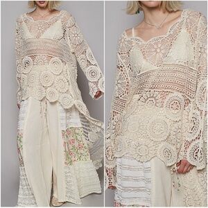 POL Cream Floral Crochet High Low Long Sleeve Top