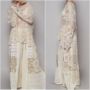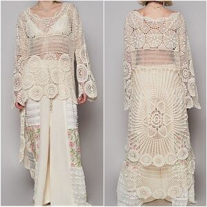 Designed in round neck long sleeve elongated fit top in crochet with various weave knitted patterns.