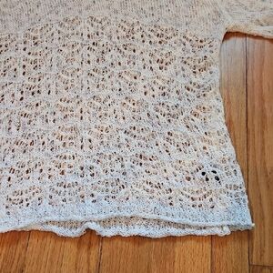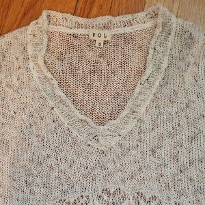 Elegant V-neck sweater by POL. Cream with intricate loose knit pattern.