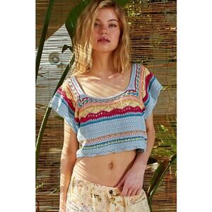 POL Crochet Cropped Short Sleeve Top in Sky Blue Boho