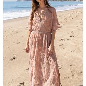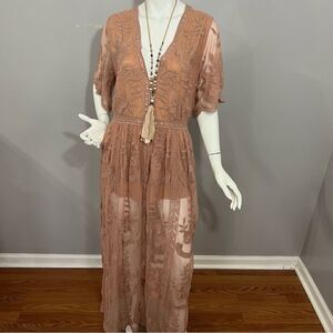 This bohemian style maxi dress has built in shorts (like a romper) underneath. The dress is covered with delicate, intricate crochet lace with slits on both sides. Flowy sleeves, banded waist, plunging v-neckline, zip back for easy on/off. Color is a dusty rose that looks almost camel/tan color at times. Perfect dress for ocean/vacation photos or a spring/summer wedding!
