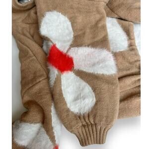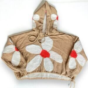 POL Daisy Fuzzy Hooded Oversized Sweater Tan White Floral Unique Pullover Small