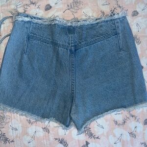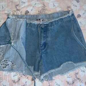 Features: Nice, quality denim, embroidered floral cutout, ties on the side, skirt with shorts and front pocket
