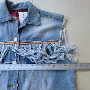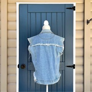 Stylish light blue denim vest with fringe detailing. Features a button-up front and sleeveless design.