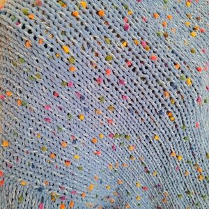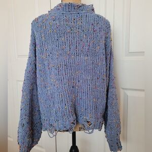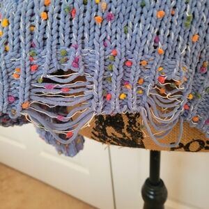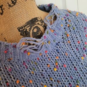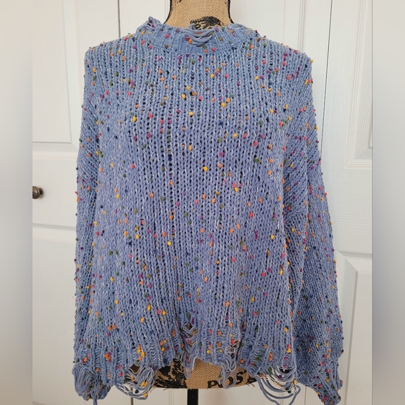 Super cute blue sweater with colorful confetti popcorn speckles throughout. Features distressed torn look at neck and hemline.