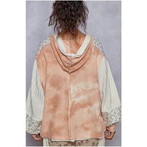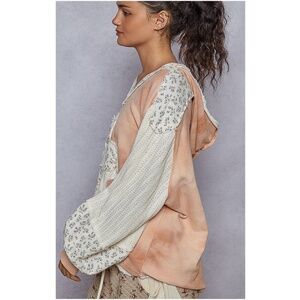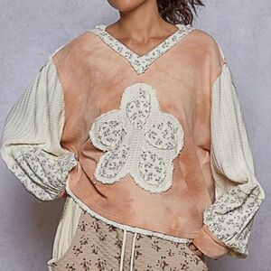 Designed in V-neck balloon sleeve relaxed fit hoodie top in thermal with cut and sew sweater knit patch, printed gauze flower patch, bottom opening panel point, raw edge, vintage washing, solid color.