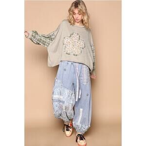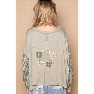 Designed in round neck balloon sleeve relaxed fit top in rib with plaid sleeve, floral print flower patch, outseam detail, vintage washing, solid color.