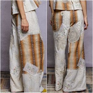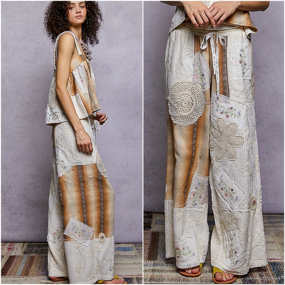 POL Floral Crochet Embroidered Color Block Stretchy Drawstring Waist Pants