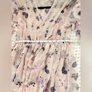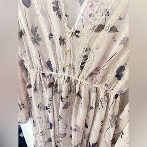 Charming dress with floral design. Beautiful lace throughout. Soft pink and cream hues. Long button sleeves for elegant style.