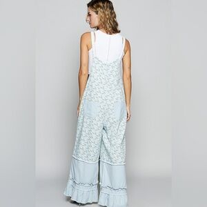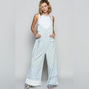 Chic light blue jumpsuit with floral design. Features wide legs and front pockets.