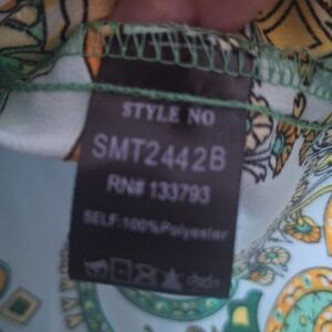 Chic blouse with floral design. Features a blend of green and yellow tones.
