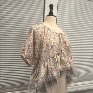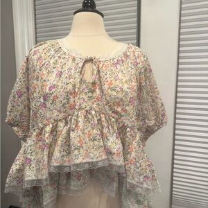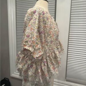 Embrace a feminine touch with this floral ruffle blouse. Perfect for any occasion, this top features a delicate floral pattern in cream and pink hues. The soft fabric and elegant design make it a must-have for your wardrobe.