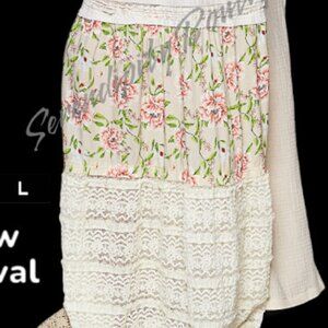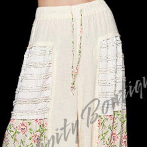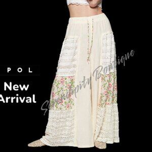 POL Fluttering Lace & Double Gauze Floral Patch Exaggerated Wide Leg Pants.