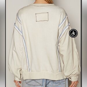 Long balloon sleeves with button cuffs, v-neck, about 3” side slits. Raw edges that are topstitched in brown and blue. Oversized fit. 60% cotton and 40% polyester.