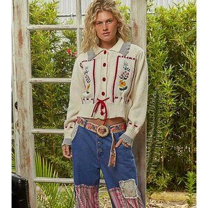 Cozy cream knit cardigan with vibrant floral embroidery, crimson buttons, and ribbon tie accents. Slightly cropped and perfect for layering